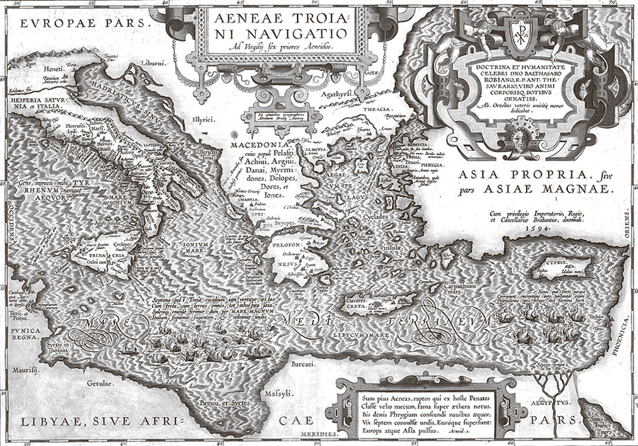 «Путь указал благодетельный демон, был остров невидим. Влажный туман окружал корабли, не светила Селена. С неба высокого тучи его покрывали густые. Острова было нельзя различить нам глазами во мраке; видеть и длинных широко на берег бегущих волн не могли мы, пока корабли не коснулись берега».[1]