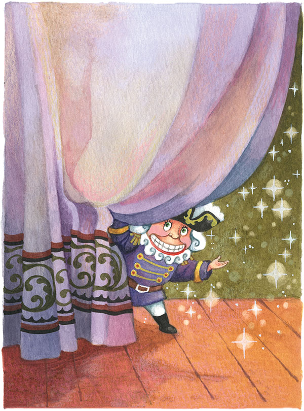 Фриц таинственным шёпотом рассказывал младшей сестрёнке (ей только что исполнилось семь лет), что он с раннего утра слышал, как в запертых комнатах шуршат, шумят и что-то тихонько приколачивают. А не так давно он видел, как в прихожую прошмыгнул низенький тёмный человечек с большим ящиком под мышкой; он отлично знает, что это не кто иной, как крёстный Дроссельмайер.