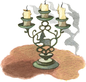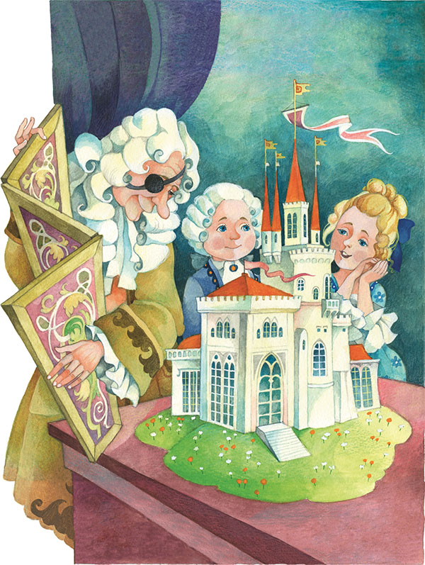 Ширму, что долго загораживала стол, наконец отодвинули, и такое великолепие предстало глазам детей! На зелёном цветущем лугу возвышался чудный замок с зеркальными окнами и золотыми башнями.