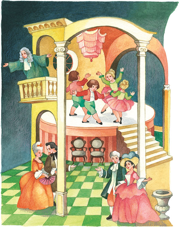 Вдруг раздался звон колокольчиков, двери и окна распахнулись, и стало видно, как по залам замка прогуливаются изящные крошечные кавалеры под руку с дамами в шляпках, украшенных перьями и вуалями. В среднем зале, который от множества крохотных свечей, горевших в серебряных люстрах, казался огненным, в такт звону колокольчиков танцевали дети. Какой-то господин в изумрудном платье часто выглядывал из окна и потом снова исчезал, а сам крёстный Дроссельмайер (только величиной с папин большой палец) время от времени выходил из дверей замка и, постояв, снова уходил внутрь.