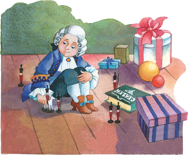 Не дождавшись ответа крёстного, мальчик подбежал к столу с подарками и принялся за своих гусар на серебристых конях: по его команде те гарцевали, нападали, отдавали честь и стреляли.