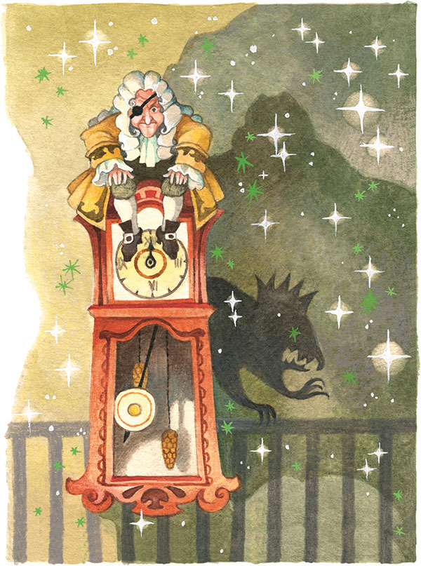 Эй вы, часики, идите,Потихонечку стучите:Короля не напугайте —Песней старой зазывайте!«Тик-так, бом-бом!Тик-так, бом-бом!»Для него ваш громкий звонБудет звуком похорон!Затем хрипло и глухо раздалось «Бом-бом!» и повторилось двенадцать раз. Мари сделалось так жутко, что от страха она чуть не убежала, как вдруг вместо совы на часах увидала крёстного Дроссельмайера в жёлтом сюртуке, полы которого, словно крылья, свешивались с двух сторон.