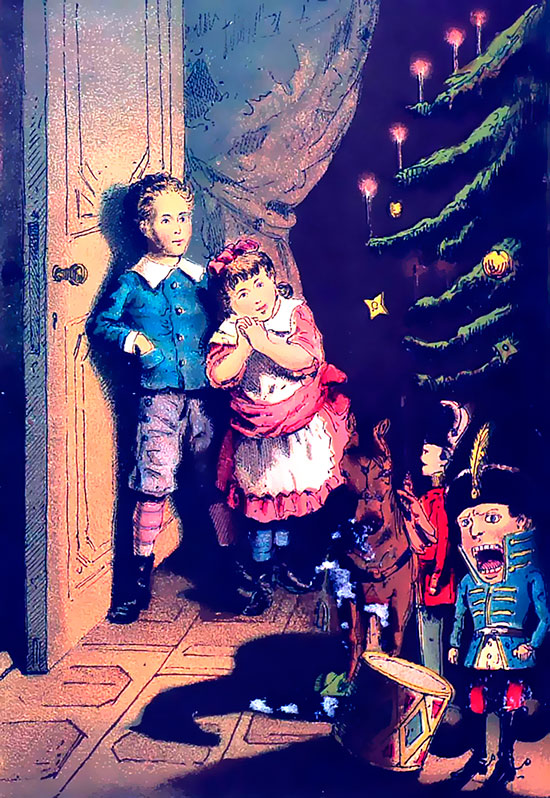 В комнате становилось между тем все темнее. Свеч не приносили. Дети наконец совсем затихли. Им казалось, что где-то далеко, далеко слышится какая-то тихая музыка. Быть-может это звенели где-нибудь колокола или играли часы на башне. Вдруг в гостиной послышался звон маленького колокольчика. Двери в столовую распахнулись. Дети вскочили и хотели бежать в гостиную, но так и замерли в дверях. Так хорошо и ярко сияла им навстречу елка, милая Рождественская елка.