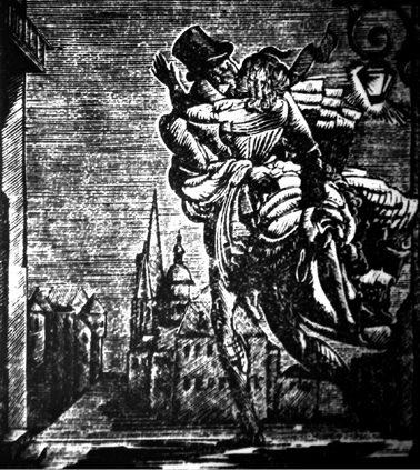 Переплетчик Лэммерхирт жил в самом верхнем этаже узкого дома на Кальбахской улице. Буря свистела и неистовствовала, шел то дождь, то снег; понятно, что господин Перегринус лишь с величайшими усилиями смог достичь своей цели. Тускло мерцали свечи в окнах Лэммерхирта, Перегринус с трудом взобрался по крутой лестнице.
