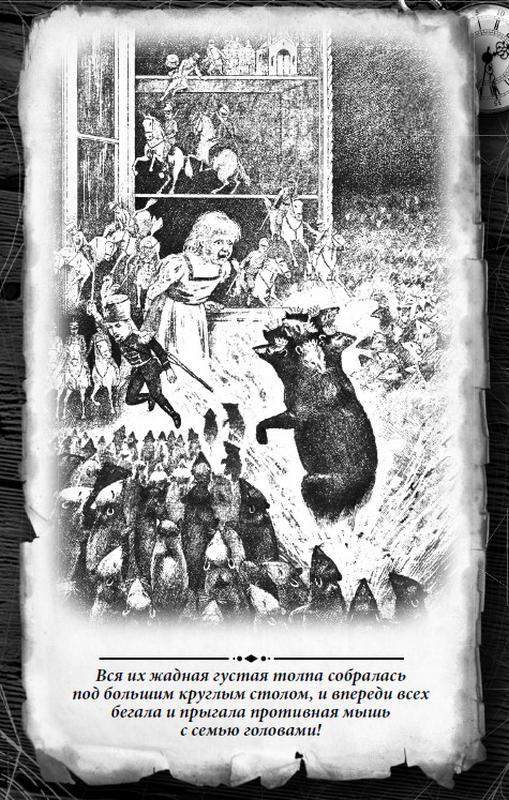 Едва Щелкунчик спрыгнул на пол, как писк и беготня мышей возобновились с новой силой. Вся их жадная густая толпа собралась под большим круглым столом, и впереди всех бегала и прыгала противная мышь с семью головами!