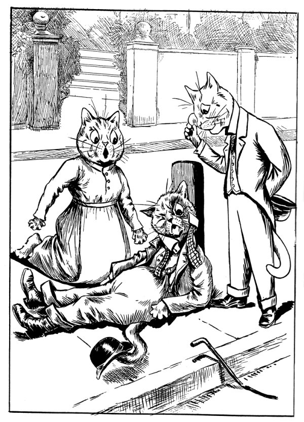 «Ich verstehe dich nicht, mein Sohn«, erwiderte Mina,»aber es kommt mir vor, als sprächest du albernes Zeug, oder als wolltest du gar deinen Vater verteidigen. Sei nicht undankbar, du wärest ganz gewiß erwürgt und gefressen worden von dem blutdürstigen Tyrannen, hätte ich dich nicht so tapfer verteidigt mit diesen scharfen Krallen, hätte ich nicht, bald hier, bald dort hinfliehend in Keller, Boden, Ställe, dich den Verfolgungen des unnatürlichen Barbaren entzogen. – Er verließ mich endlich! nie habe ich ihn wiedergesehen! Und doch schlägt noch mein Herz für ihn! – Es war ein schöner Kater! – Viele hielten ihn seines Anstandes, seiner feinen Sitten wegen, für einen reisenden Grafen. – Ich glaubte nun, im kleinen häuslichen Zirkel meine Mutterpflichten übend, ein stilles, ruhiges Leben führen zu können, doch der entsetzlichste Schlag sollte mich noch treffen. – Als ich von einem kleinen Spaziergange einst heimkehrte, weg warst du samt deinem Geschwister! – Ein altes Weib hatte mich Tages zuvor in meinem Schlupfwinkel entdeckt, und allerlei verfängliche Worte von ins Wasser werfen und dergleichen gesprochen. – Nun! ein Glück, daß du, mein Sohn, gerettet, komm nochmals an meine Brust, Geliebter!«—