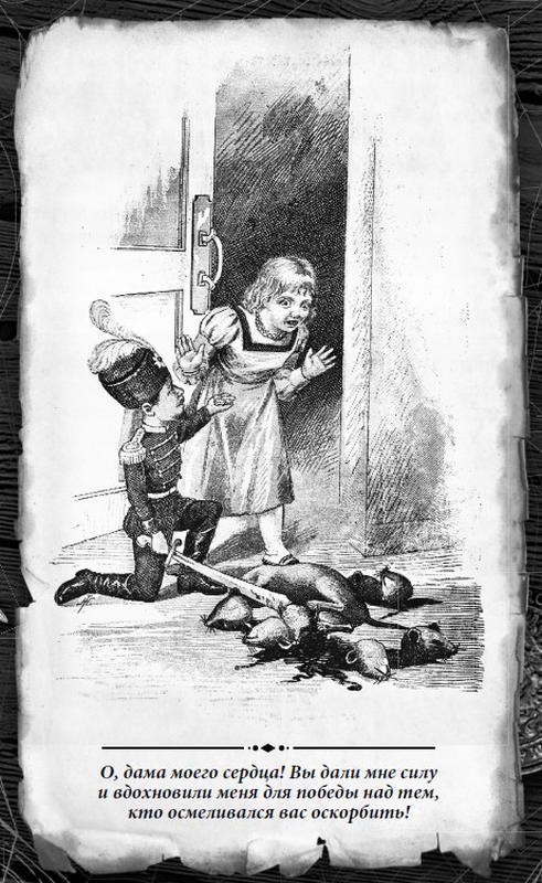 – О, дама моего сердца! Вы дали мне силу и вдохновили меня для победы над тем, кто осмеливался вас оскорбить! Мышиный король, смертельно раненный, купается в собственной крови. Не откажите принять из рук преданного вам до гроба рыцаря трофеи его победы!