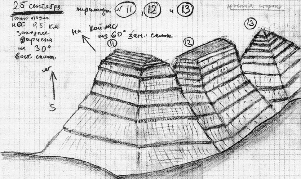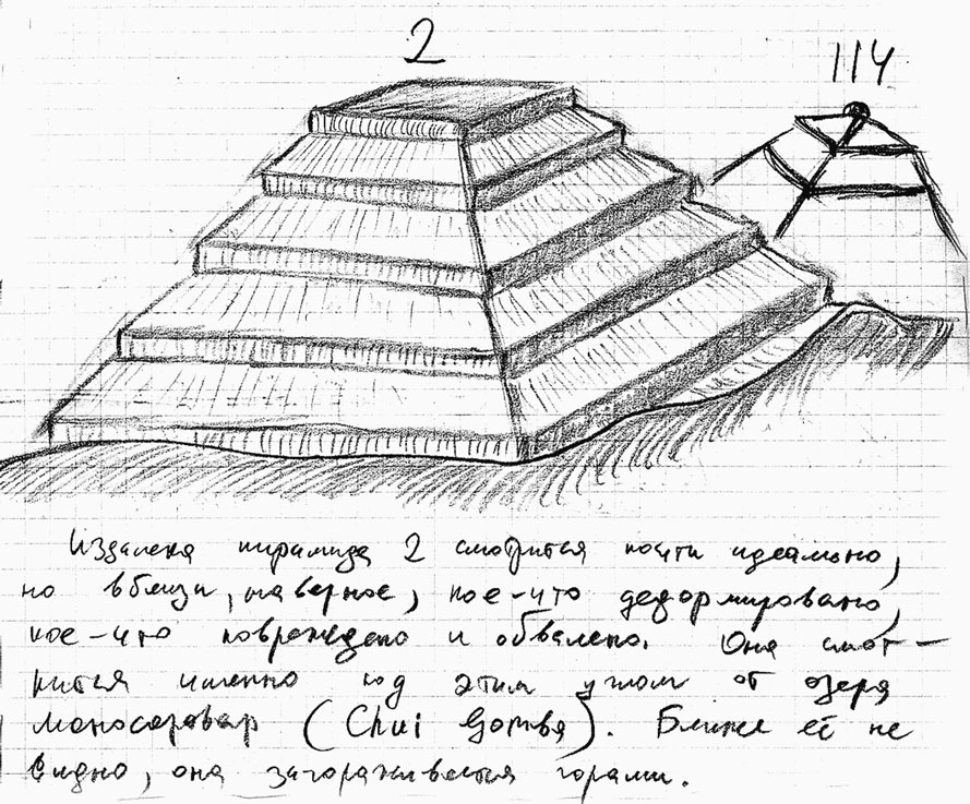 Полевой рисунок второй пирамидальной горы. Рядом видна еще одна гора, похожая на пирамидальную конструкцию (№ 114)