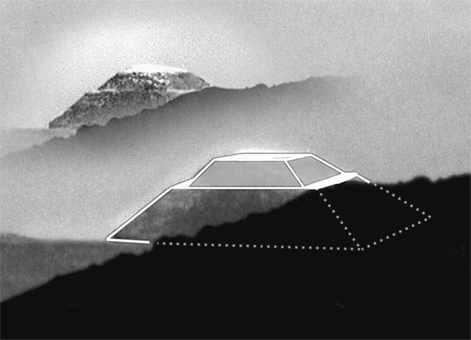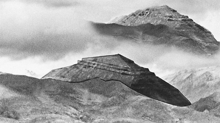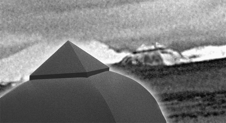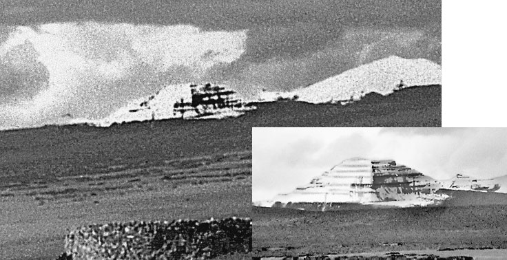 Неожиданно луч заходящего солнца пробился из-за туч и осветил участок ландшафта чуть восточнее первых увиденных пирамидальных гор. И в этом луче из холодного сумрака выплыла еще одна пирамидальная конструкция.