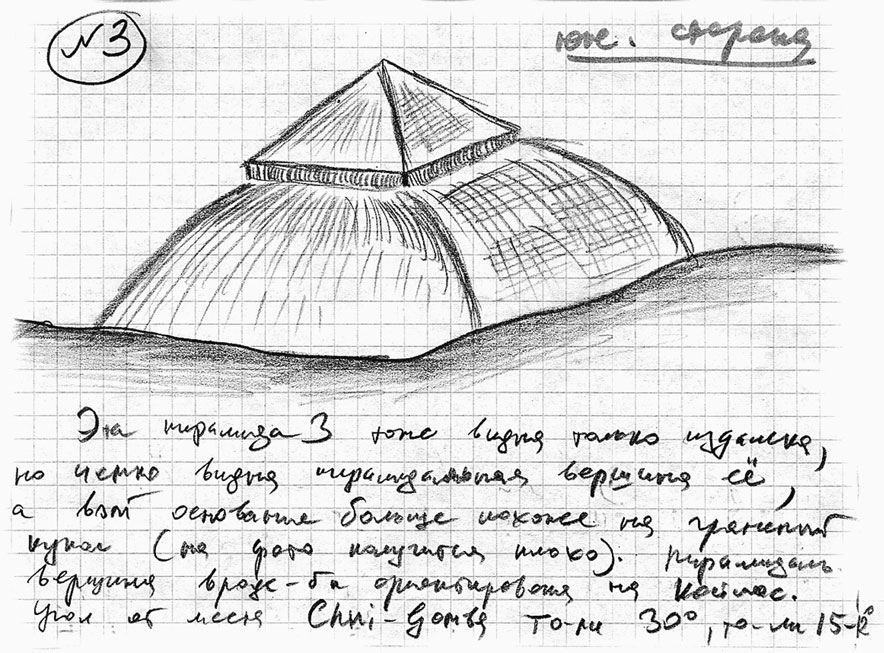 Я быстро зарисовал эту пирамидальную гору, боясь, что ее снова закроет облаком, после чего сфотографировал на обычную и цифровую камеры. Мне показалось, что рядом с этой пирамидальной горой, чуть поодаль, находится еще одна пирамидальная конструкция, но другой формы и меньшая по размеру. В бинокль было видно, что она довольно сильно занесена снегом, но грани и цилиндрический выступ на вершине прослеживались довольно хорошо. Я зарисовал и эту конструкцию, не будучи уверенным, что она имеет отношение к пирамидам.