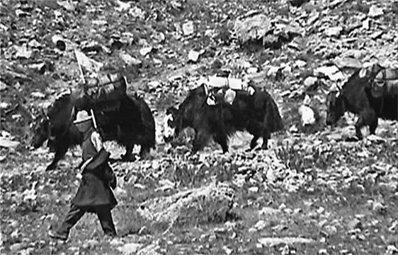 Я окликнул погонщика и проводника Тату. После оживленной беседы между ними Тату объяснил, что этот як воспринял меня за погонщика, поэтому он останавливается тогда, когда останавливаюсь я, то есть «погонщик». Так его приучили с детства.