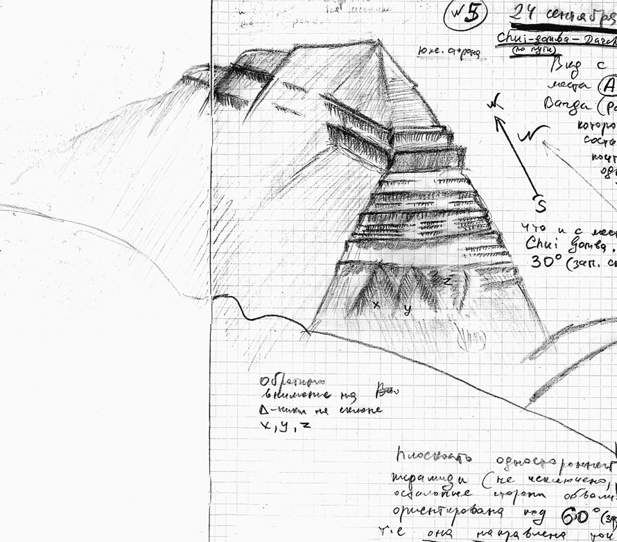 У меня эта необычная гора вызывала сомнения в принадлежности к пирамидам, уж больно вычурной и экстравагантной она была. Извечный вопрос о роли пирамид не давал покоя, не позволяя применить логический метод научного анализа. Нам оставалось только скрупулезно зарисовывать детали и фотографировать, надеясь, что фотографии получатся.
