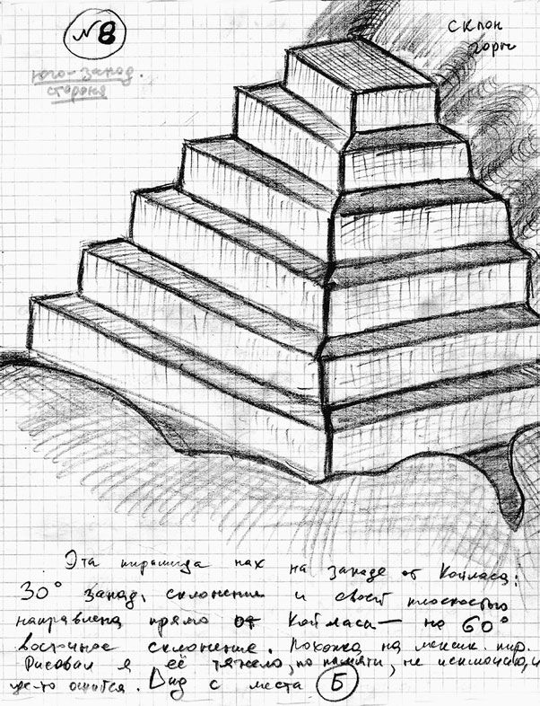 Отойдя назад, я зарисовал эту пирамидальную конструкцию: получилось, что она имеет форму усеченной пирамиды с одной ярко выраженной ступенью. И, конечно же, надо сказать, что эта пирамидоподобная гора была громадна, намного больше, чем пирамида Хеопса.
