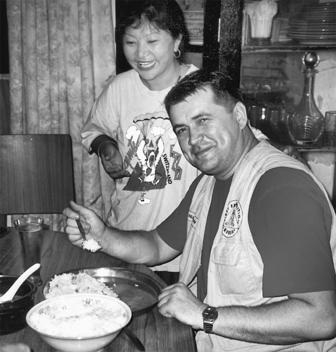 Несколько дней мы потратили на скучные хождения в китайское посольство в Непале за визами на Тибет. Но ответа из Пекина все не было. Миссис Персис – президент туристической фирмы, организовавшей нашу поездку на Тибет, чтобы развеять тревоги пригласила нас к себе домой на ужин. Она по непальским масштабам была состоятельным человеком. Случайно заглянув на кухню, я заметил там солидного размера тазик. Помня, что Селиверстов обладает завидным аппетитом, (он съедает по 100 пельменей за раз), я предложил наложить ему полный тазик риса, обещая, что мой друг справится с поставленной задачей. Всех домочадцев, особенно детей, это привело в дикий восторг.