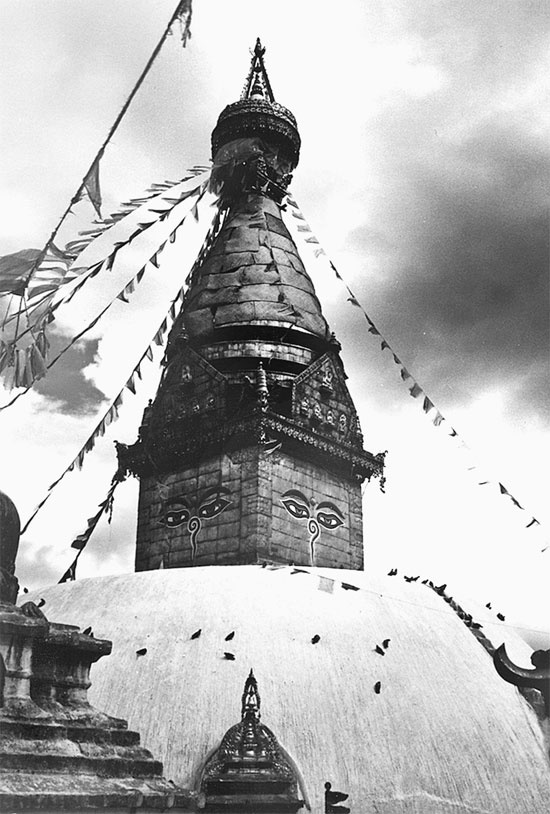 Ступа Сваямбанат была прекрасна, несмотря на то, что она ремонтировалась. Из центра огромного белого купола возвышалось четырехгранное сооружение, на каждой стороне которого были нарисованы необычные глаза. Над четырехгранным сооружением высился ступенчатый конус, на вершине обрамленный чем-то наподобие колокола.