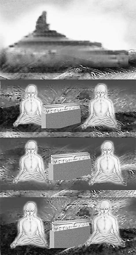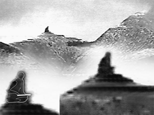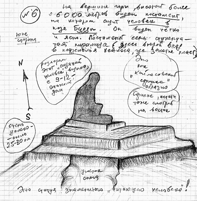 Дойдя до нужного места, мы установили штатив и сделали съемку при максимальном увеличении, после чего я начал рисовать, всматриваясь в окуляр видеокамеры. Было вполне четко видно, что это и в самом деле громадная статуя человека, сидящего в позе Будды. К сожалению, условия видимости в высокогорье, когда все тени черные и плохо видны полутени, не позволяли рассмотреть детали статуи. Но я надеялся на последующую компьютерную обработку снимков. Тем не менее, было видно, что голова статуи склонена вперед, будто бы этот громадный человек читает книгу, лежащую на коленях. Статуя располагалась на многоступенчатом постаменте, а вернее была установлена на вершине ступенчатой пирамиды, высота которой была не менее 6000 метров. Статуя была повернута лицом на восток. Примерное расстояние до статуи Читающего Человека равнялось 25–30 км. Размер статуи мы оценили как минимум с 10–12-этажный дом.