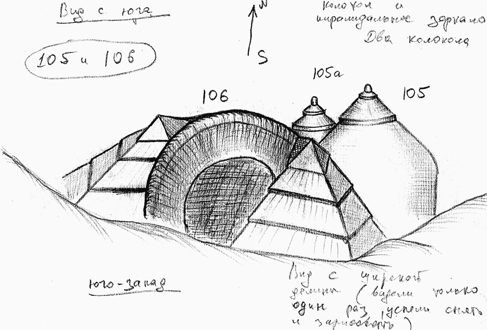 Несмотря на то, что хорошо разглядеть эту конструкцию, примыкающую к четко видным «колоколам», мне не удалось, я все же зарисовал ее. У меня получилось, что огромная каменная дуга по концам примыкает к двум ступенчатым пирамидам.