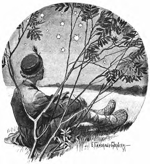 Стало в третий раз смеркаться,Надо младшему сбираться;Он и усом не ведёт,На печи в углу поётИзо всей дурацкой мочи:«Распрекрасные вы очи!»Братья ну ему пенять,Стали в поле погонять,Но, сколь долго ни кричали,Только голос потеряли:Он ни с места. НаконецПодошёл к нему отец,Говорит ему: «Послушай,Побегáй в дозор, Ванюша;Я куплю тебе лубков[2],Дам гороху и бобов».Тут Иван с печи слезает,Малахай[3] свой надевает,Хлеб за пазуху кладёт,Караул держать идёт.