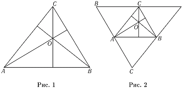 Высоты треугольника (ABC) пересекаются в точке (О). (Высота – это перпендикуляр, опущенный из вершины на противолежащую сторону или на ее продолжение). На первый взгляд непонятно, с чего им пересекаться в одной точке; три произвольные прямые не пересекаются, они обычно образуют треугольник. Проведем через каждую вершину прямую, параллельную противолежащей стороне, в результате чего получим больший треугольник А’В’С'. Он состоит из четырех конгруэнтных треугольников. Высоты ABC в большем треугольнике являются перпендикулярами, восстановленными в серединах сторон, их «линиями симметрии». Перпендикуляр, восстановленный в точке С, должен содержать все точки, удаленные на одинаковое расстояние от точек А’ и В’; перпендикуляр, восстановленный в точке B, должен содержать все точки, удаленные на одинаковое расстояние от точек А’ и С’. Следовательно, точка, в которой пересекаются эти перпендикуляры, удалена на равные расстояния от всех трех вершин А’, В’, С’ и, следовательно, должна лежать на перпендикуляре, восстановленном в т. А, поскольку он содержит все точки, равноудаленные от точек В’ и С’. Q.E.D[29].
