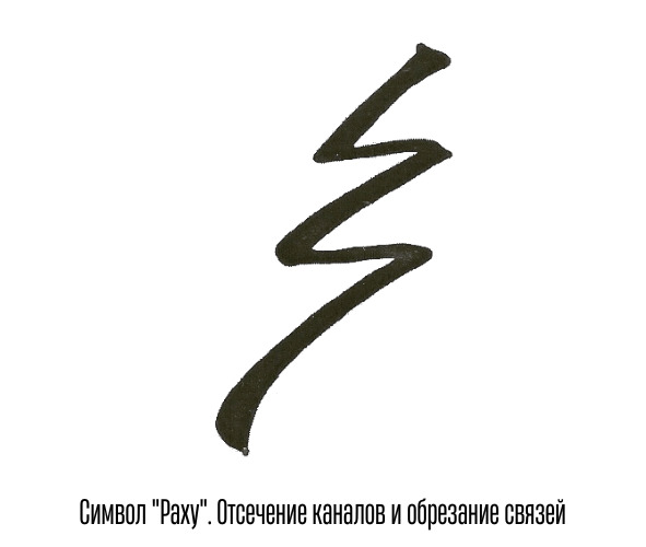 Энергия работает сама, остановку вы ощутите. Обычно это 5—10 минут. Завершив сеанс, вы благодарите энергию, отпускаете ее. Изображаете важнейший символ духовных практик – Раху. Отсечение каналов (нужно обрезать эфирные нити с клиентом). Его используют только при взаимодействии с кем-то или чем-то, для себя не нужно, только если работали с исцелением Рода или кармы прошлых воплощений. Его рисуют ребром ладони в воздухе, представляя, как все нити между вами и клиентом распадаются – Раху режет их, как нож, гармонично и без вреда.