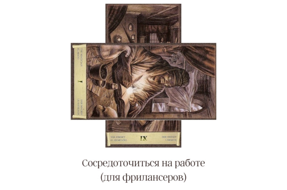 Пример такой формулы: по Отшельнику я работаю медленно, в свое удовольствие, не спеша и не соблюдая дедлайны. Мне не хватает энергии на какой-то проект, и я хочу закончить его быстро, а не тратить уйму времени. Более активная и схожая по смыслу карта здесь – Маг.