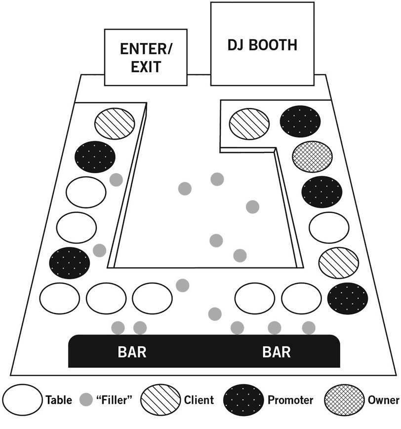 Обстановка внутри VIP-клуба в Нью-Йорке с вместимостью до трехсот человек и семнадцатью столиками. В любой выходной вечер клуб ожидает, что от трех до пяти клиентов забронируют столик, а он сам наймет от четырех до пяти промоутеров, которые займут специально расположенные столики. «Наполнители» будут распределены по танцполу и у бара