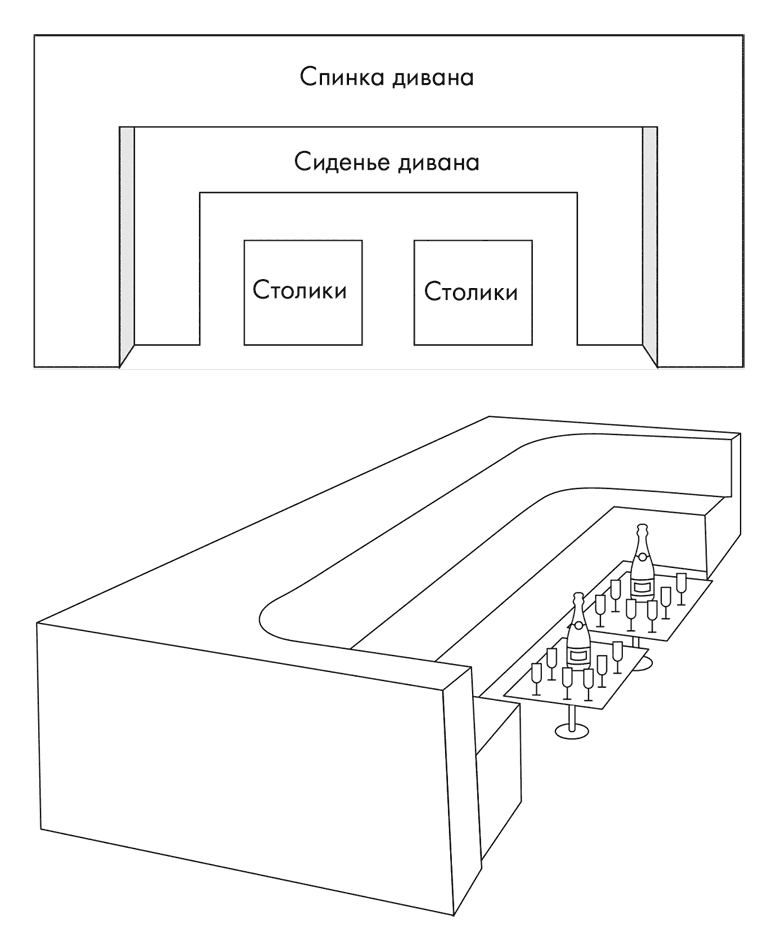 «Столик» – это пространство, в которое входят диван, на котором могут сидеть или стоять несколько человек, а лучше танцевать; а также парочка низких столиков, где обычно ставят бутылки, бокалы и ведра со льдом. Столик вроде того, что изображен на рисунке 2, обычно вмещает от десяти до пятнадцати человек. В многолюдные вечера гости могут залезать на спинки диванов и даже занимать соседние столики и танцевальную площадку.
