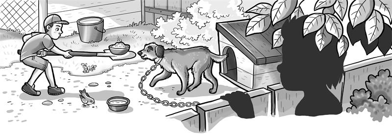 Полкан сидел у бабушки на цепи. Увидев знакомую миску, задрал чёрный нос и принюхался, дружелюбно помахивая хвостом. Женька не решился подойти близко: он боялся, мало ли что у собаки на уме, да ещё старой.