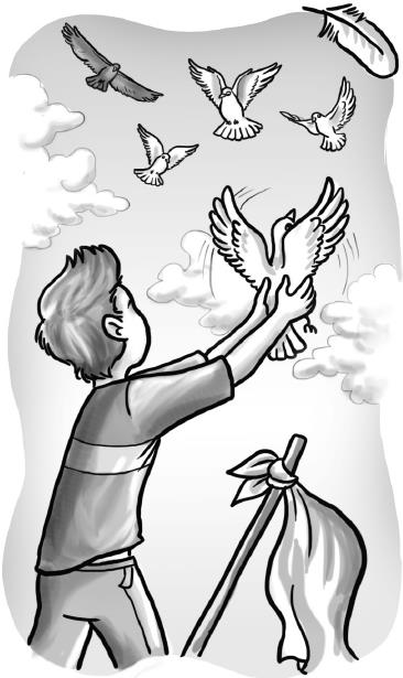 Вдруг Пашка перестал свистеть и замер с шестом в руках. Женька посмотрел вверх и увидел крупную, величественно парящую в небе птицу. Пашка бросил шест, метнулся в голубятню и выскочил оттуда с крупным белым голубем. Мальчик обхватил тельце птицы руками, а крылья оставил свободными. Он торопливо то поднимал голубя вверх, то опускал вниз, понуждая птицу взмахивать крыльями. Стая приняла сигнал и начала опускаться вниз. Вскоре все пять голубей скрылись в голубятне. Ястреб сделал круг над садом и улетел.