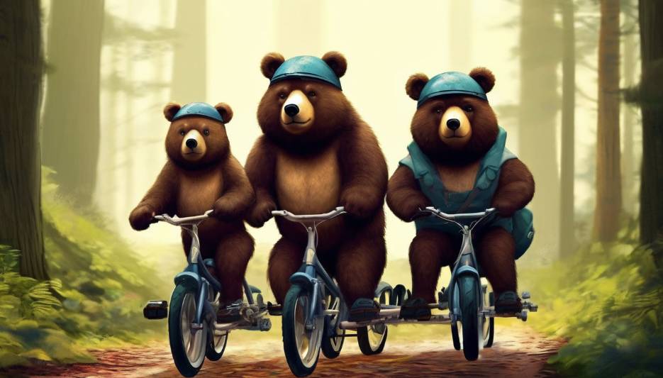 Мама и папа Медвежонка сидели на отдельных сиденьях и крутили педали, а у Медвежонка было детское кресло. На головах у всех были велосипедные шлемы.