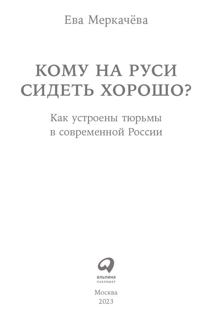 Книга «Кому на Руси сидеть хорошо? Как устроены тюрьмы в современной России» – новая работа известной российской журналистки (титулованной за очерки в газете «Московский комсомолец» званием «Золотое перо России»), активного правозащитника, члена Общественной наблюдательной комиссии (ОНК) города Москвы, члена Совета при Президенте РФ по развитию гражданского общества и правам человека Евы Меркачёвой. Книга родилась на основе публикаций автора в ее родной газете. Недавно из печати почти одновременно вышли две ее книги – «Град обреченных»[3] и «Тесак, Фургал и другие»[4]. Обе посвящены трудной для общества теме – проблеме смертной казни как уголовному наказанию и тюремному миру осужденных за самые тяжкие и опасные преступления. Обе – в контексте главного вопроса о том, оправдан ли существующий в России запрет на применение смертной казни к таким преступникам. Ответ на него непрост, так как вряд ли еще какая уголовно-правовая проблема волнует людей (в равной мере юристов и неюристов) так, как проблема смертной казни. Сколько высказывается доводов за и против такого вида наказания!