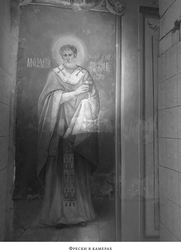 Мы идем по корпусам, то и дело попадаются фрески с иконами. Некоторые из них уже отреставрированы, другие только проглядывают из-под многолетних слоев краски и штукатурки. Часть помещений – с белокаменными сводами, а некоторые камеры рассчитаны на одного жильца и напоминают кельи.
