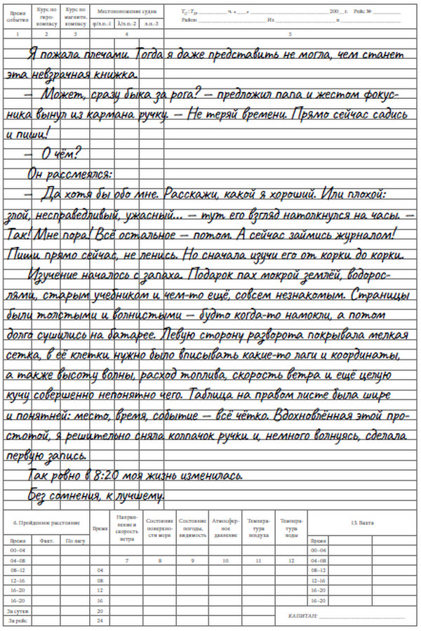 Папа – моряк. А также путешественник, механик, слесарь, электрик, радист, повар, спасатель и даже певец. Он говорит, что моряк должен уметь всё: прокладывать курс, чинить лебёдку, предсказывать погоду, молчать, коптить рыбу, радоваться жизни, ставить парус, защищаться, беседовать с ветром, понимать чужие языки и, конечно, отлично плавать. Там ещё много чего – всего не перечислить. Иначе, по его мнению, пропадёшь. Ах да! Как же я забыла знаменитое «Чудес не бывает», а также «Надейся только на себя» и самое любимое «Овёс к лошади не ходит». Нет, всё-таки главные любимчики – это «Работа и Результат». Эту рр-рычащую парочку я просто ненавижу, даже больше, чем «уу» – «Уроки и Уборку».
