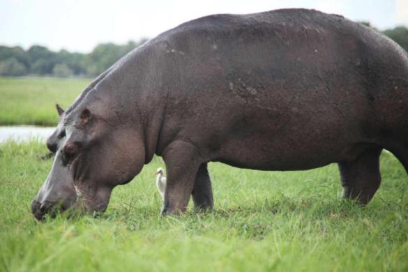 Но в воде им порой становится тесно или грустно. И тогда вот такие махины выходят в мир травку пощипать и сдать свою шкурку в химчистку. В роли химчистки тут проворные белые птицы. Они, кстати, и за стоматологов при бегемотах работают!