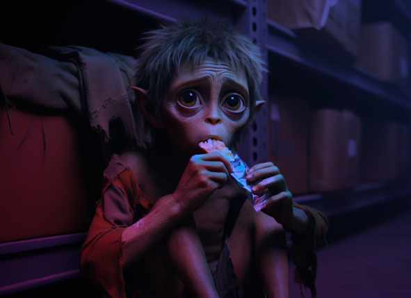 Даниэль вытащил из кармана свой недоеденный протеиновый батончик и метко сбросил его на пол. Малыш, истощённый и голодный, почуял соблазнительный аромат. После некоторых колебаний он осторожно подошёл ближе. Жадно вглядываясь по сторонам в поисках опасности, он стал разворачивать хрустящую упаковку со вкусной находкой.