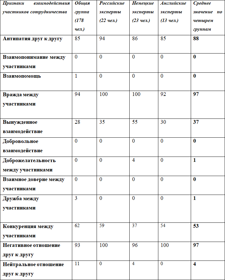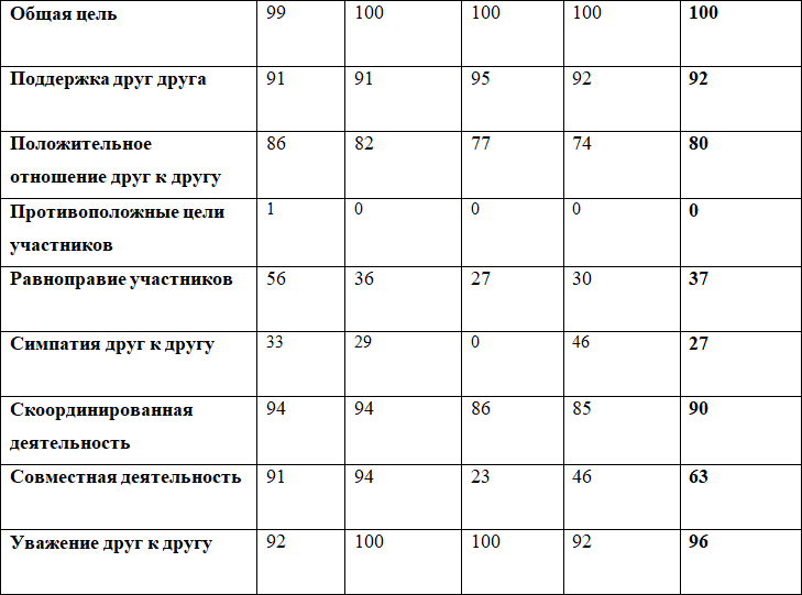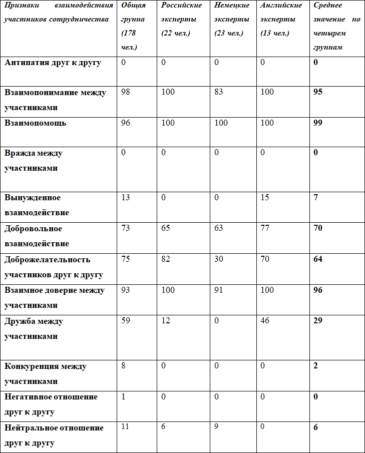 Результаты, представленные в таблицах говорят сами за себя. Если в качестве важных характеристик сотрудничества считать только такие, которые признают не менее 90 % участников исследования, то ими оказываются: