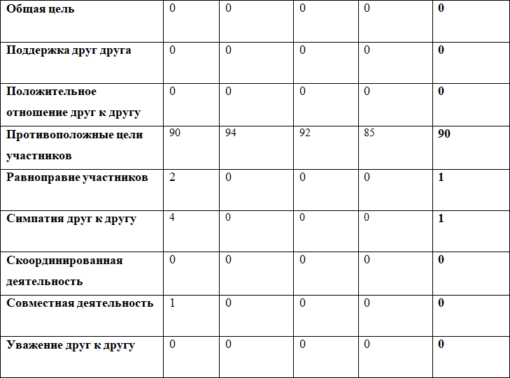 Причем первые три признака характеризуют совместные действия, направленные на достижение общей цели, а последующие описывают отношения между участниками.