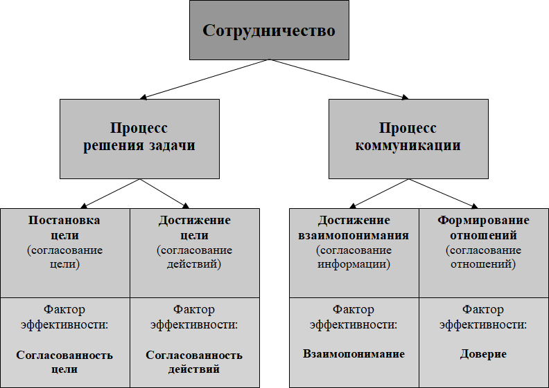 Процесс решения задачи (или достижения цели), в свою очередь, предполагает две составляющих: 1) постановка цели и 2) действия участников по ее достижению. Постановка цели участниками – тоже процесс. В этом процессе происходит обсуждение и согласование их представлений о цели, часто довольно бурное, которое должно привести к однозначно понимаемой и принимаемой всеми участниками формулировке цели. Если на этом этапе не удастся достичь взаимопонимания, не удастся согласовать общую цель, сотрудничество не состоится. Важным критерием эффективности сотрудничеств на данном этапе является согласованность цели.