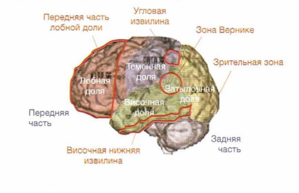 О строении головного мозга. Каждое полушарие человеческого мозга поделено на 4 доли: лобную, теменную, височную и затылочную. Каждая из них отвечает за определённые функции: лобная-за движение, теменная – за осязание, височная -за слух, затылочная- за зрение. Передний отдел лобной доли особенно развит только у человека и отвечает за память, общение, самоконтроль, творчество. (рис.1)