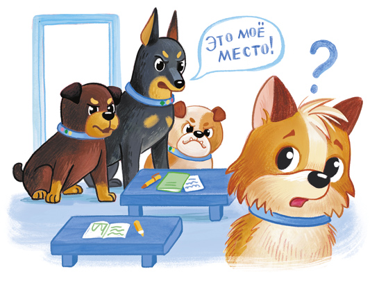 Тим робко вошёл в класс и осмотрелся. В классе было светло и просторно. Здесь помещались шесть парт, учительский стол и портреты известных собак над доской. Но всё, что увидел Тим за пару мгновений, – это одиннадцать блестящих носов, и каждый нос принюхивался к нему. Тим поёжился.