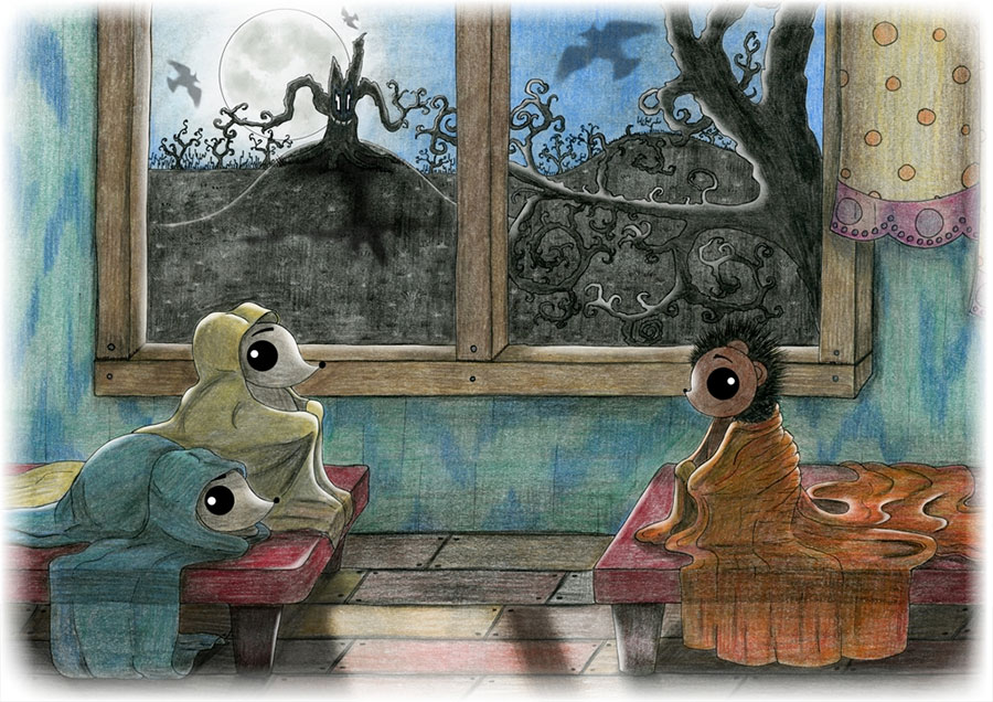 Вечером, когда приходило время ложиться спать, трое друзей закутывались в свои одеяла и рассказывали друг другу страшилки. Братья Мышата, Ники и Фип, больше любили слушать. Да что тут говорить! У Егорки был просто талант пугать, заставлять их поджилки трястись, а сердца замирать! Он то звонко шептал, то подвывал. А иногда его голос начинал так хрипеть и скрипеть, что мышата почти верили, что это уже не Егорка перед ними, а кто-то другой, занявший его место! Мало того, Ёжик еще постоянно незаметно постукивал по печной трубе, шуршал сухой веткой по стене или по полу и выдумывал всё новые, леденящие душу звуки для своих ночных историй. А Ники и Фип, закутанные так, что торчали только их подрагивающие носики, прижимались друг к другу и дрожали что есть силы. Конечно, они знали, что это просто страшные небылицы. Но не могли же они отказать себе в удовольствии хорошенько побояться перед сном! Когда дом в лесу, то от любой мало-мальски жуткой выдумки душа в пятки уходит. А уж сказки Егорки были вершиной пугательности и дрожательности!