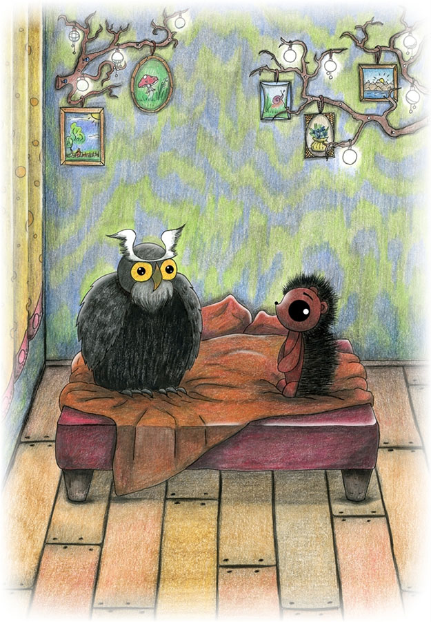 Егорка сидел на своей кровати, а рядом с ним – огромный чёрный филин с седыми бровями и большими жёлтыми глазами, которые смотрели на Фипа весело и насмешливо.