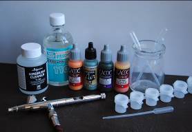 Чернила для аэрографии имеют разнообразный химический состав. Большинство марок красителей для аэрографа имеют очень широкую цветовую палитру. Наиболее популярными для небольших художественных работ являются акриловые краски, пигменты которых особо тщательно измельчаются, чтобы не закупоривать сопло аэрографа. Они бывают укрывистыми и полупрозрачными; матовыми, перламутровыми, с металлическим блеском или флуоресцентным эффектом. Эти краски можно разбавлять или смешивать между собой. Краска ложится ровным тонким слоем и быстро высыхает на изделии, позволяя быстро нанести новый оттенок на поверхность. Яркие цвета не выгорают и не осыпаются со временем.