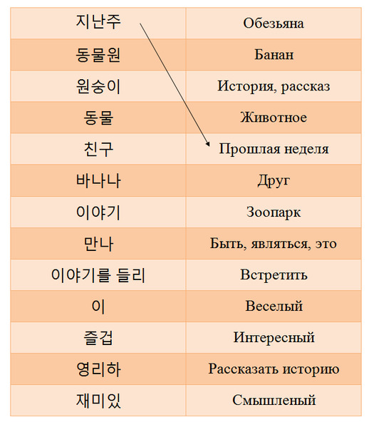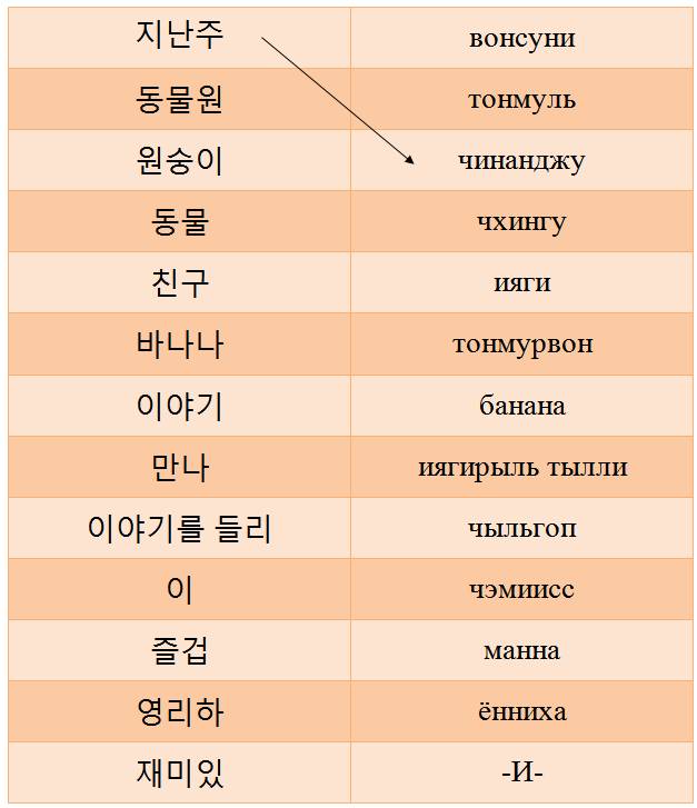 Нэиль (завтра), кобуги (черепаха), хангук (Южная Корея), оди (где, куда?), мигук (Америка, США), муот (что?), конбу (учеба), сэнмурхак (биология), ёно (английский язык), ттона (покидать), ка (ехать, уезжать), ха (делать), конбурыль ха (учиться, буквально – учебу делать), конбуха (учить).