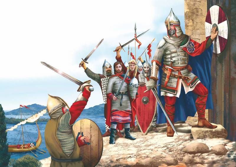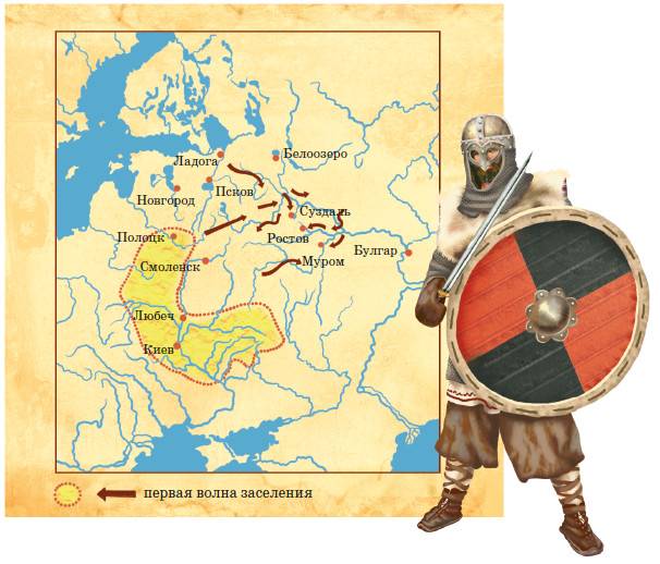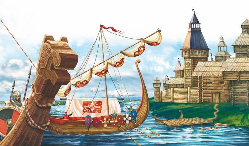 В центре владений полян на Днепре в IX в. был построен город, получивший имя вождя Кия, который правил в нем с братьями Щеком и Хоривом. Киев стоял в очень удобным месте на пересечении дорог и быстро разрастался как торговый центр. В 864 г. два скандинава-варяга Аскольд и Дир захватили Киев и стали там править. Они ходили в набег на Византию, но вернулись, сильно потрепанные греками. Варяги оказались на Днепре не случайно – он был частью единого водного пути из Балтийского в Черное море («из варяг в греки»). Кое-где водная дорога прерывалась возвышенностями. Там варяги тащили свои легкие ладьи на спине или волоком. Словом «волок» и стали обозначать такие сухопутные участки водного пути.