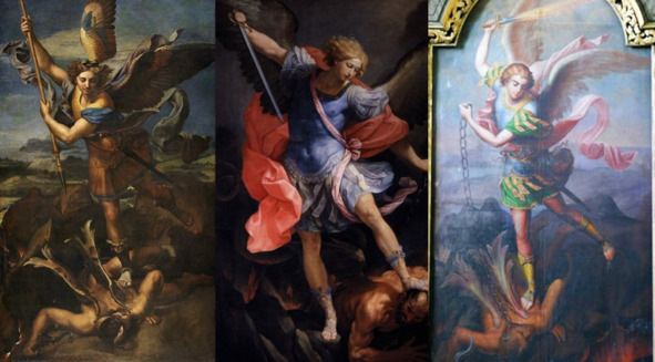 Коллаж из трёх картин, слева направо: Рафаэль Санти «Архангел Михаил сокрушающий дьявола», Гвидо Рени «Михаил Архангел», образ Архангела Михаила в иезуитском костёле Гродно.