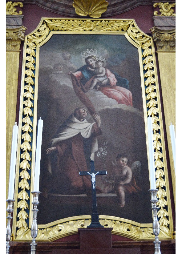 Первый алтарь левого нефа вмещает образ Матери Божией и Св. Симона Стока. Автором называют талантливого художника Антония Грушецкого. Написано полотно в 1782 году. Этот образ – одна из наиболее интересных в художественном плане картин города, среди созданных в эпоху Речи Посполитой. Композиция отлично вписана в вертикальный формат полотна. Внизу холста выделяется ангелок с блаженной улыбкой, он кажется полным гармонии и умиротворения. Связанные полотном скапулярия Симон и Богоматерь, вносят в образ динамику, а сумрачные облака, служащие фоном, разрешаются в верхней части картины более светлыми разводами, с которыми сливаются ангельские лики, эффектно отеняющие главных персонажей. Подобное решение, в стиле барокко, отсылает к работам Рембрандта.