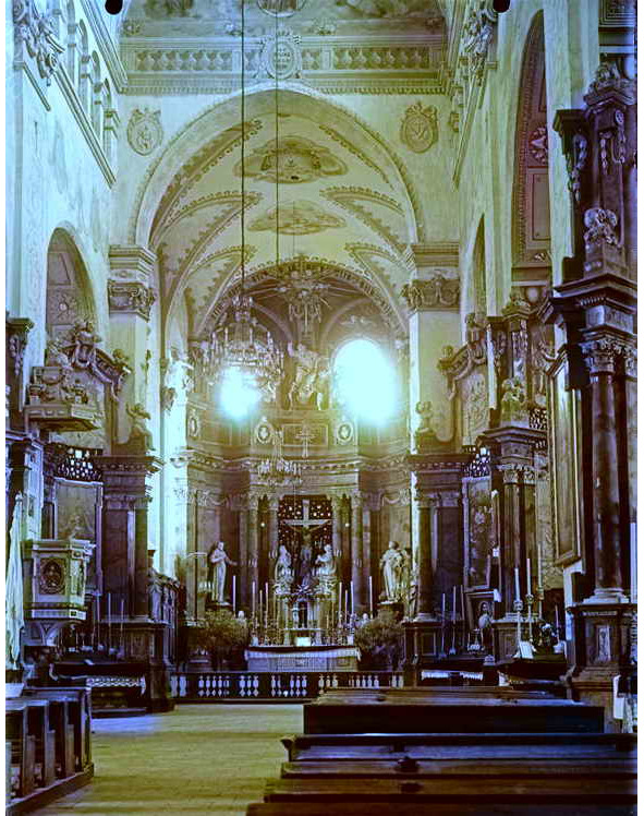 Внутри этой величественной базилики находятся великолепные алтари, тонированные под мрамор с большим искусством. Интерьер насыщен стукковой декорацией: как круглой скульптурой, так и многофигурными рельефами. Стиль алтарей представляет собой переход от барокко к классицизму. Их художественное решение отличает, с одной стороны – чёткость и строгость классицизма, с другой – ощутимое желание создать более экспрессивные, текучие формы, при помощи дуговых завершений верхнего яруса и несколько хаотичных гирлянд в духе барокко. Эффектно смотрятся рельефные стукковые панно, выступающие доминантами верхних ярусов всех алтарей, кроме главного.
