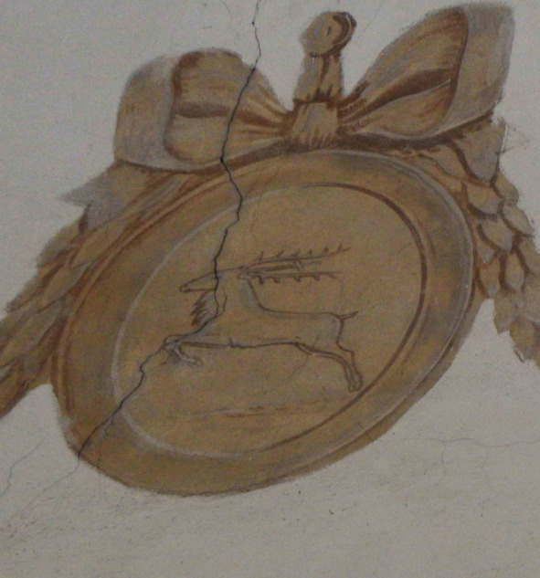 Примечательна и роспись храма, в частности, стоит отметить ряд шляхетских гербов вверху центрального нефа. Всего гербов 16, по 8 с каждой стороны. Ближе всего к алтарю, с обеих сторон, гербы ВКЛ и Польши. Сразу за государственными гербами, с левой стороны, размещены гербы Лис и Багория. В данном случае, они, очевидно, представляют могучие роды Сапег и Воловичей, члены которых были меценатами храма. Далее находится герб князей Мосальских. Таким образом, похоже, что гербы размещены в порядке иерархии их хозяев. Ближе к главному алтарю изображены гербы более значительных семейств, а завершаются геральдические ряды государственными гербами, которые в данном контексте можно понимать и как личные эмблемы монархов – благодетелей храма. С правой стороны размещены, среди прочих, гербы влиятельных в городе шляхтичей Эйсмонтов (герб Кораб) и Сципио-дель-Кампо (герб Сципио). Подобная «политическая» живопись, легко объясняется фактом проведения сеймиков шляхты в бернардинском костёле. С правой стороны, вблизи от входа, помещён олень Св. Губерта (Евстафия).