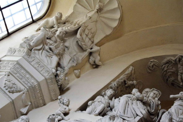 Довольно крупный орган храма был украшен сложной барочной резьбой. Венчало его несколько выразительных скульптур.